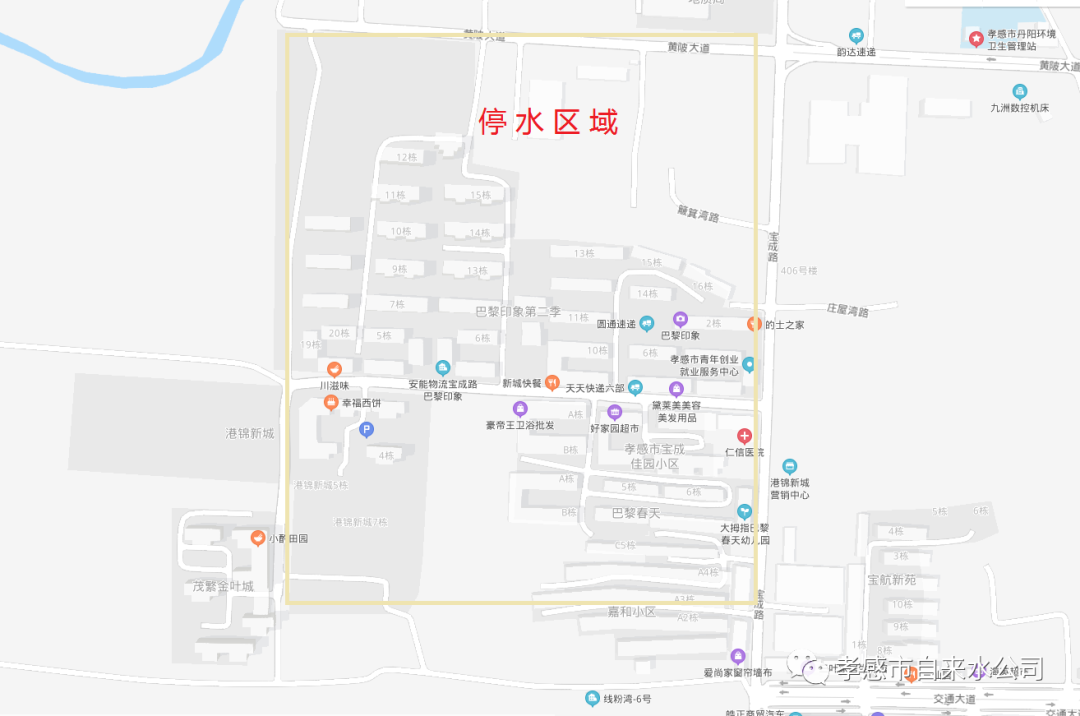 因宝成路巴黎印象供水管网碰头,我公司将于2020年9月25日(周五)晚21:00至次日早晨8:00进行施工作业(如遇雨天,施工顺延),届时仁信医院、巴黎印象,巴黎春天、港锦新城、宝成佳园等小区及周边区域将暂停供水。请上述区域的客户相互转告,提前储水备用,并及时检查和关闭内部用水设施。
